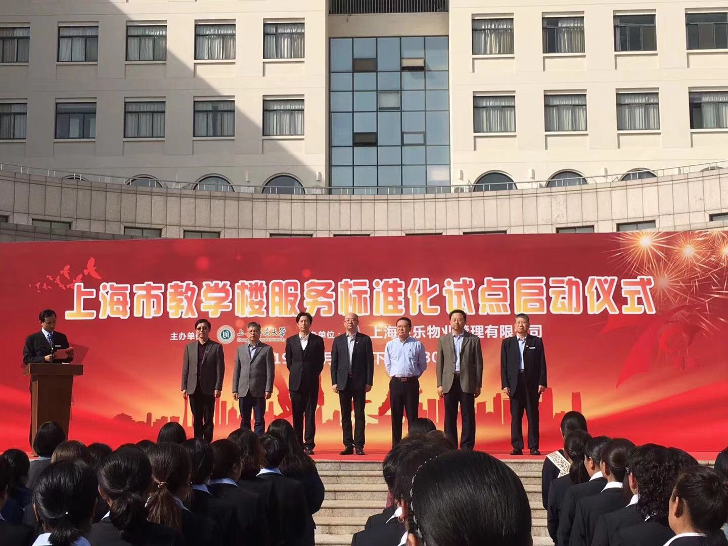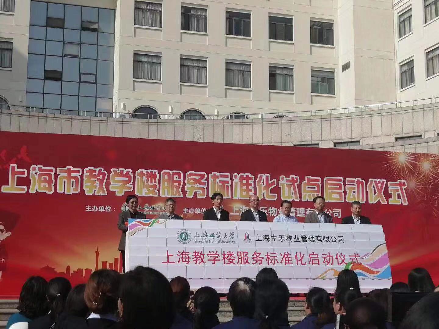 2019年10月30日,“教学楼服务标准化市级试点”启动仪式在上海师范大学奉贤校区图书馆广场正式开始。上海市教育委员会学校后勤保卫处处长张旭、上海市市场监督管理局标准化处副调研员倪敏、上海市虹口区市场监督管理局副局长邬琪、上海师范大学副校长张峥嵘、上海高校后勤服务股份有限公司总经理陈辉、上海生乐物业管理有限公司董事长柏志成、总经理陆卫华等出席了启动仪式。仪式由陆卫华总经理主持。